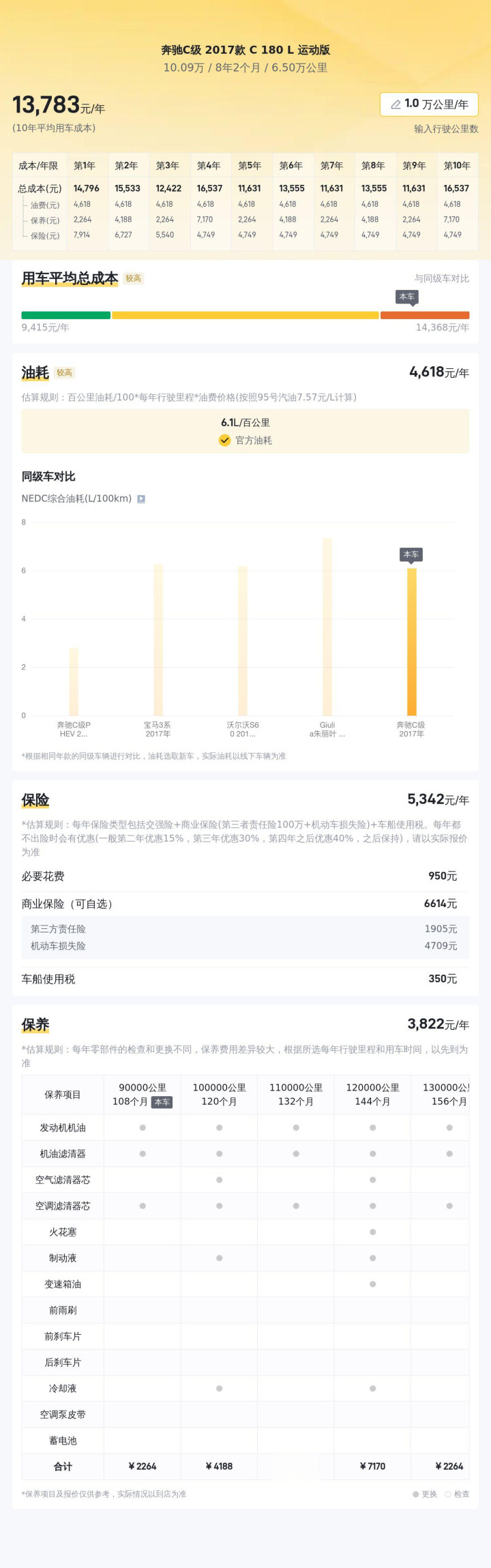 根据数据显示,这辆奔驰C级 2017款 C 180 L 运动版的10年平均用车成本为14187元/年。其中,油耗成本为5208元/年,保险费用为5554元/年,保养费用为1442元/年,年检费用为183元/年。这样的用车成本在同级别车型中属于合理范围之内。